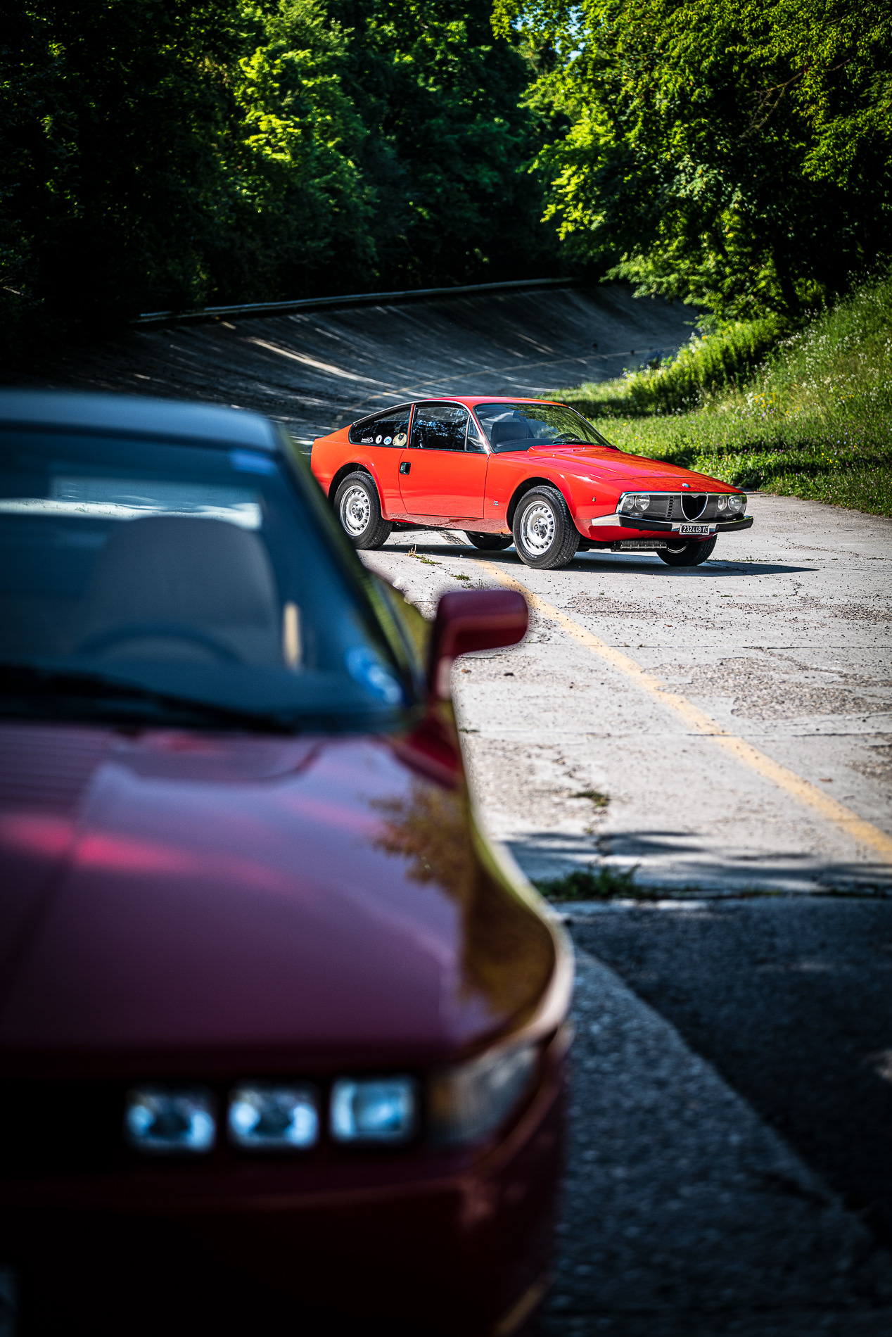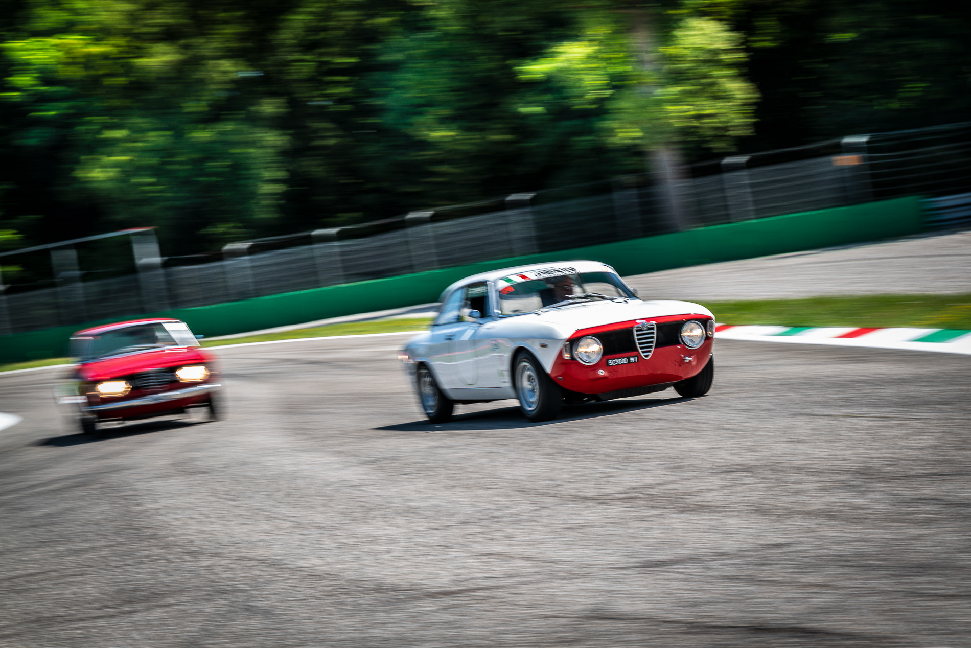 We arrived at Monza Circuit driving two stunning examples of Alfa Romeo Giulia Gt Veloce, one built in 1967, incredibly preserved in its original red paint and in perfect conditions with original Italian plates, and the other one, built in 1966, presented in a superb racing livery and prepared for historic competitions at maximum level by its owner Giuseppe, a very well renown mechanic specialist.